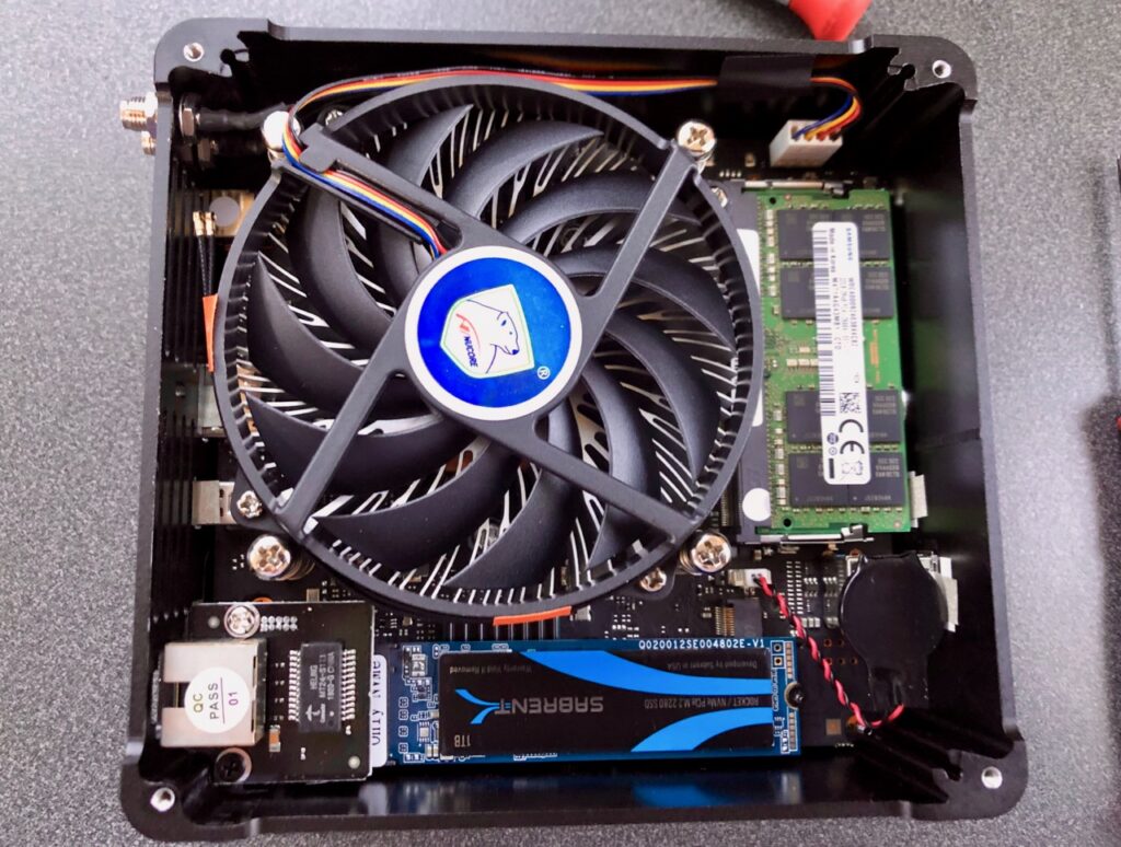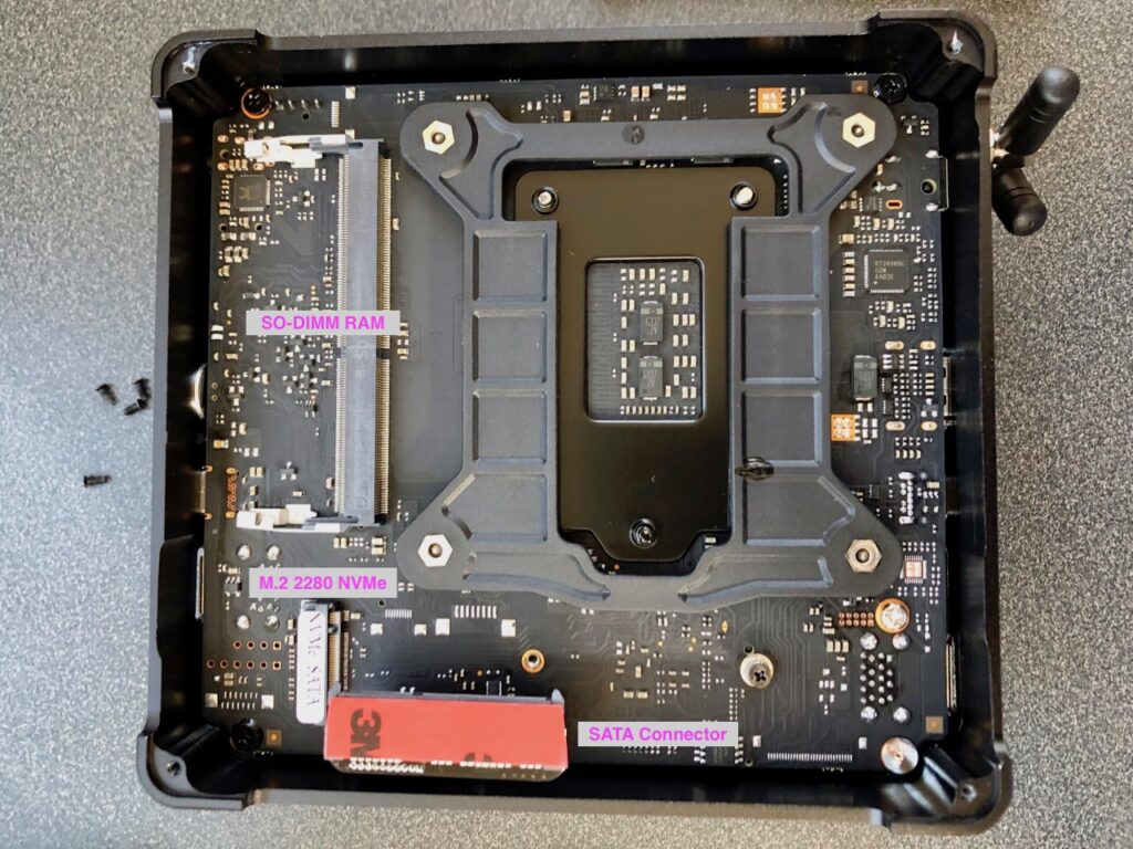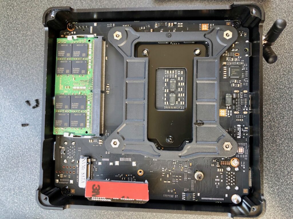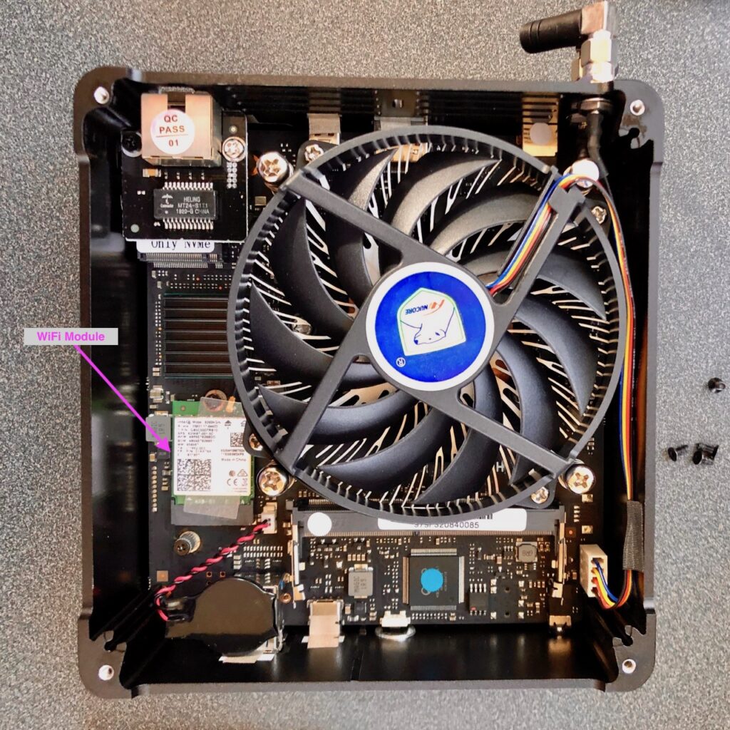 Next I will install a RAM module and the SSD on the top side. But before I do, I will remove the WiFi card. The reason for this is that I will not be using WiFi with these nodes, so I do not want to deal with configuring them out later. The challenge with removing them is that the manufacture attached a protective plastic piece on the top side of the card, ostensibly so that the antenna wires aren’t easily detached. With some careful prying, I was able to get to the mounting screw and then remove the card. Then I detached the antenna wires from the WiFi card. I considered removing these wires from the case connector on their other end, but I did not see an easy way to do so without disassembling more of the computer. I ended up simply using some electrical tape to tape the wires against the frame of the cooling fan. After doing that, the RAM module and M.2 SSD were easy to install. I also chose to remove the antennas attached to the exterior of the case since they too would not be used.